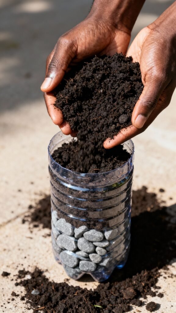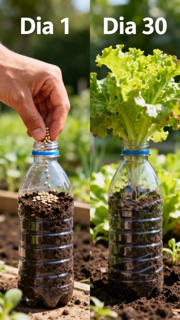 💡 Dica prática: Use garrafas transparentes para ver o nível de umidade da terra!